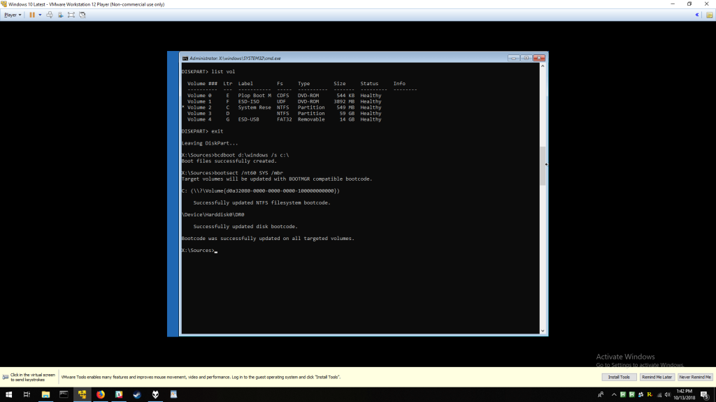 *Note: If you are trying to run bcdboot C:\Windows from a recovery console outside of your Windows installation (such as from the Windows 10 installation media), C:\Windows is probably D:\Windows (your operating system) while C:\ is probably your system partition (the boot info). Entering diskpart and then list vol will display drive volumes so you know what’s what (type exit to close diskpart). To run the bcdboot operation from a recovery environment, you want something like this command: bcdboot D:\Windows /s C:\