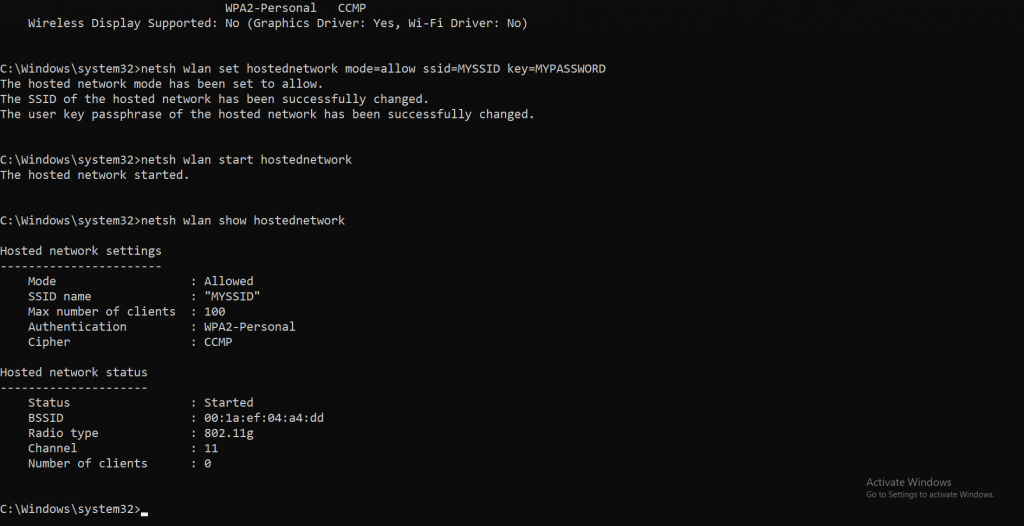 Also enter this line to enable the hotspot: netsh wlan start hostednetwork (stop works too) and you can check the status of your new hotspot by entering netsh wlan show hostednetwork.